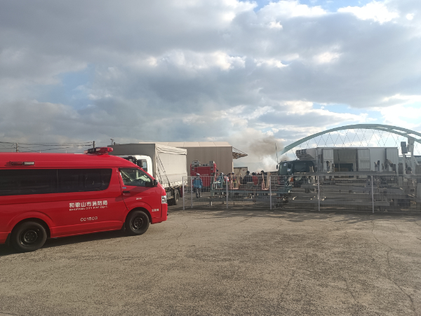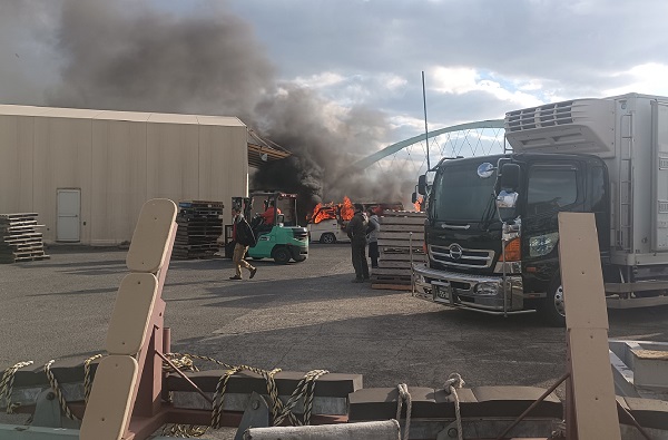 消防車が来る前にフォークリフトに乗った人の機転で燃えている車をフォークで持ち上げて倉庫から離したため、倉庫は燃えずに済みましたが、もし倉庫に火が付いていたらそこから更に隣の事務所にも延焼する大惨事となっていたかもしれません。