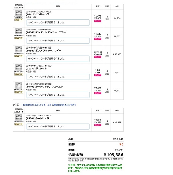 そのうち部品の発注ですが、実は1月21日(水)に久しぶりにモノタロウの全品10%オフがありまして、この日は車や船の純正部品まで含めて全て10%引きとなりますので、自社艇サンフィッシャー33の部品をそこそこ多めに発注しました。
