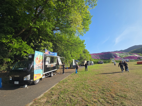 芝桜が咲いている箇所に上る手前にはキッチンカーがいっぱいあり、オムライスなど食べてみたいとも思いましたが今回の目当ては芝桜ですので山頂まで急ぎます。