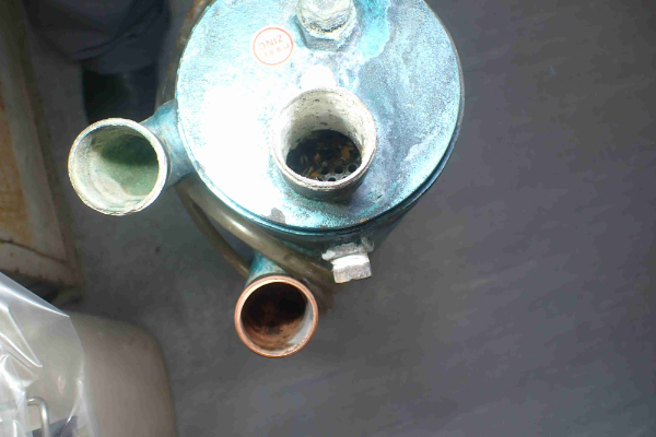 こちらのヒートエクスチェンジャーだけでなく、オイルクーラー、エアクーラー部にまで詰まっていたようで、これが原因で海水の流れが悪くなり、ホースに圧力が掛って抜けたのが原因かと思われます。